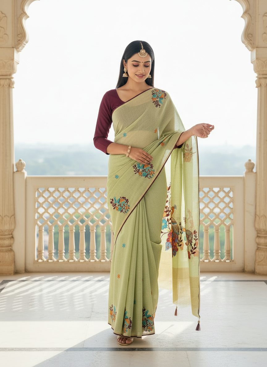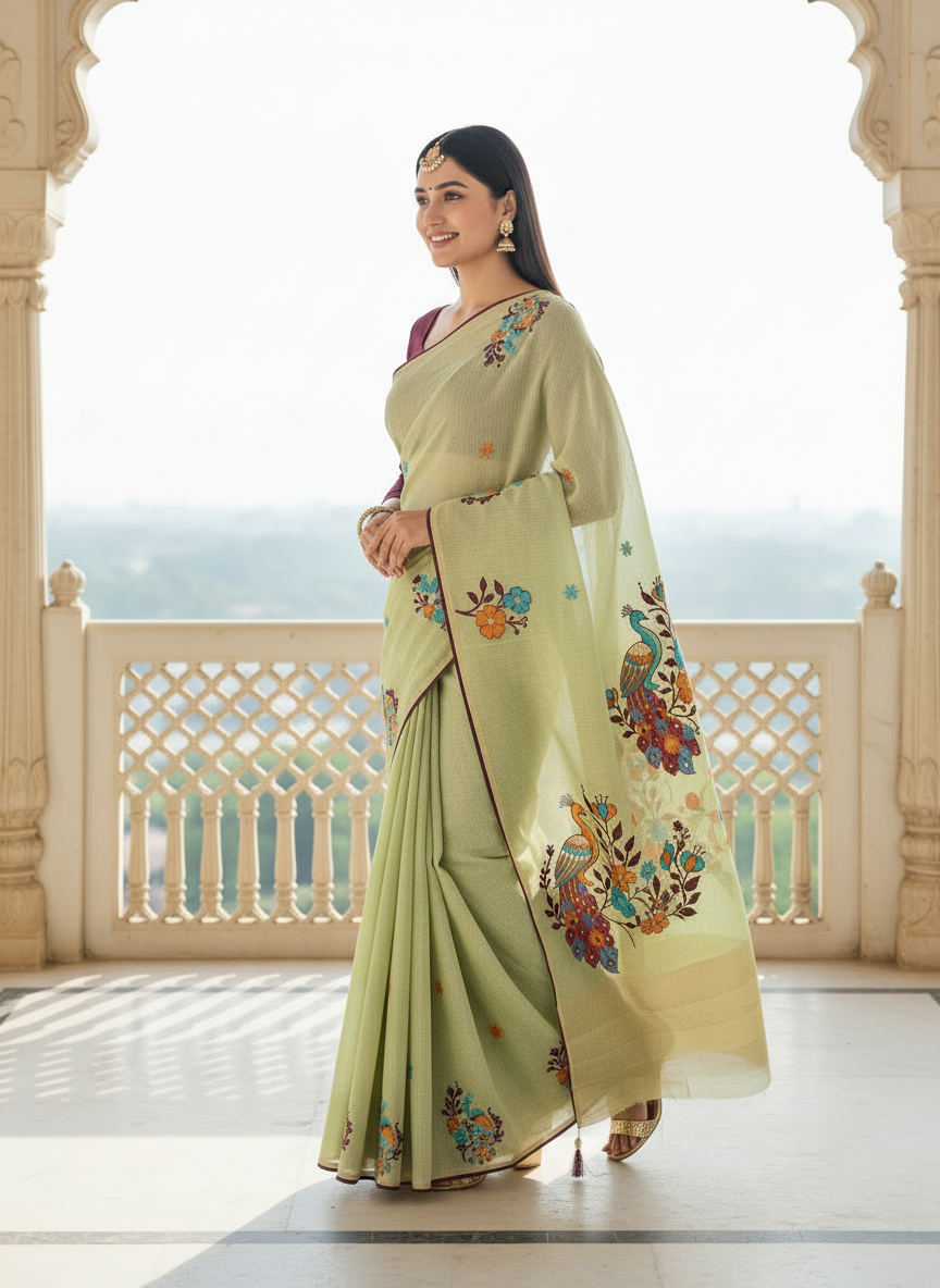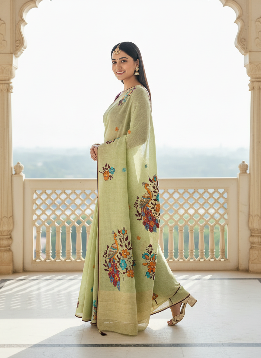 An elegant pastel green saree adorned with intricate peacock and floral embroidery, perfect for festive occasions, weddings, and graceful day events.