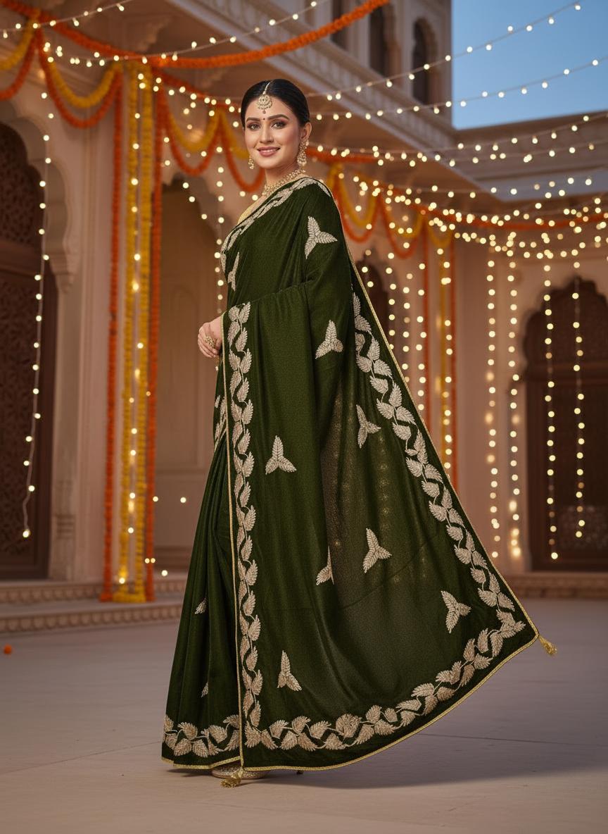 Step into timeless elegance with this embroidered saree, designed to make every festive moment special. Crafted in a rich, flowy fabric, this saree features exquisite leaf and vine embroidery in contrasting light tones, beautifully highlighting the deep green base. The elegant border and scattered motifs add a regal charm, making this saree a perfect blend of traditional craftsmanship and modern sophistication.
