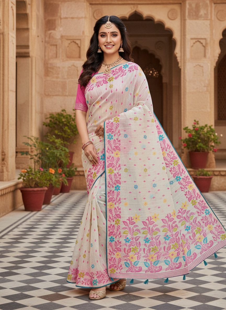 A graceful off-white saree adorned with pastel floral prints and a charming pink border, perfect for festive and elegant daytime occasions.
